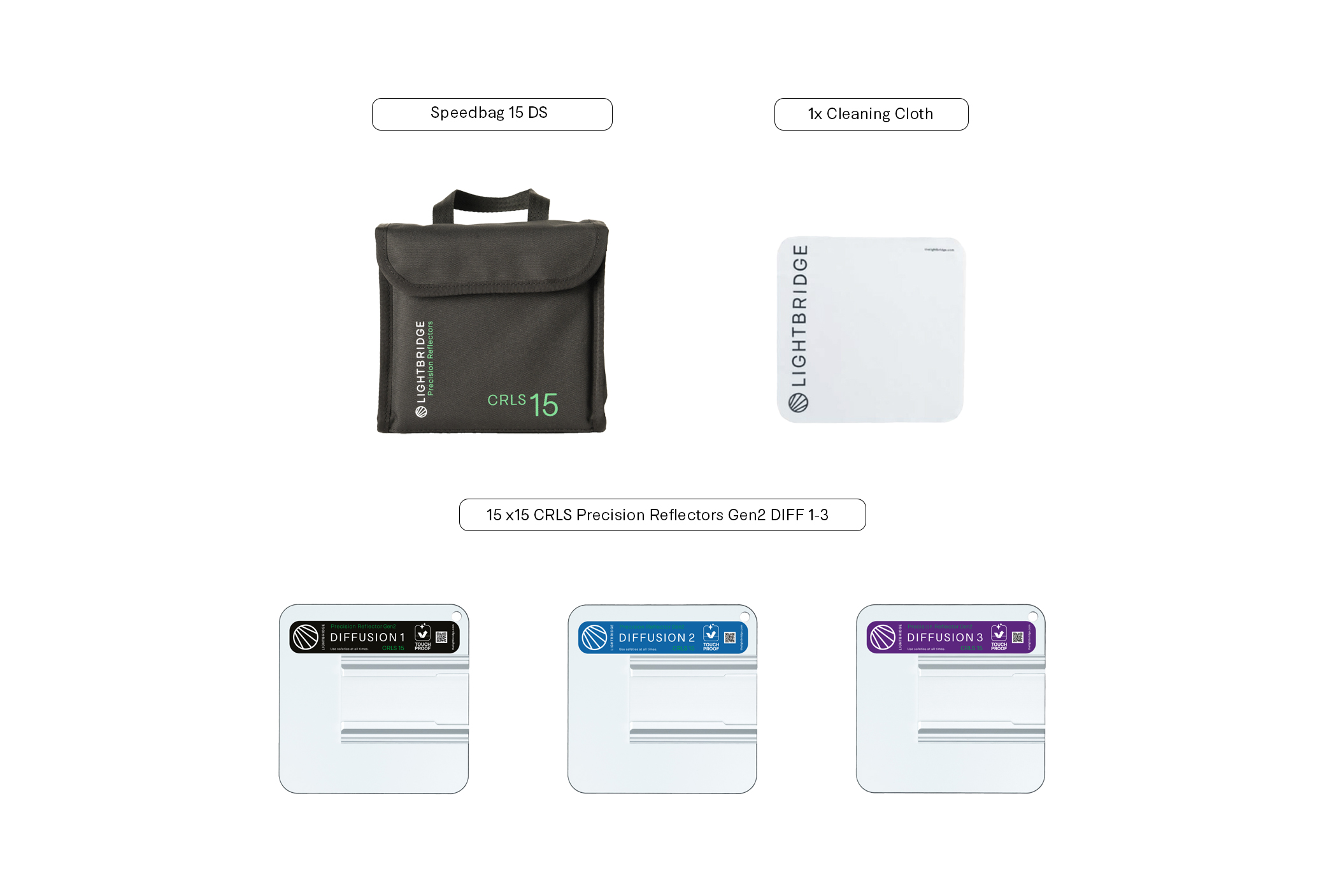 The C-Diff 15 Core DS Kit is a easy to carry portable Speedbag containing the full range of Touchproof Precision Reflectors, offering maximum versatility and efficiency on set.